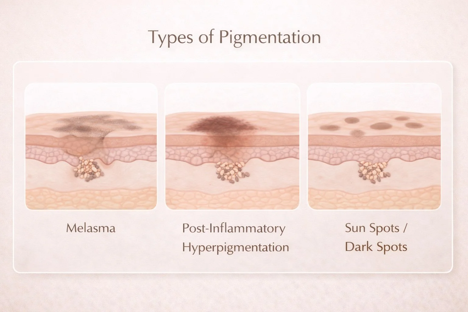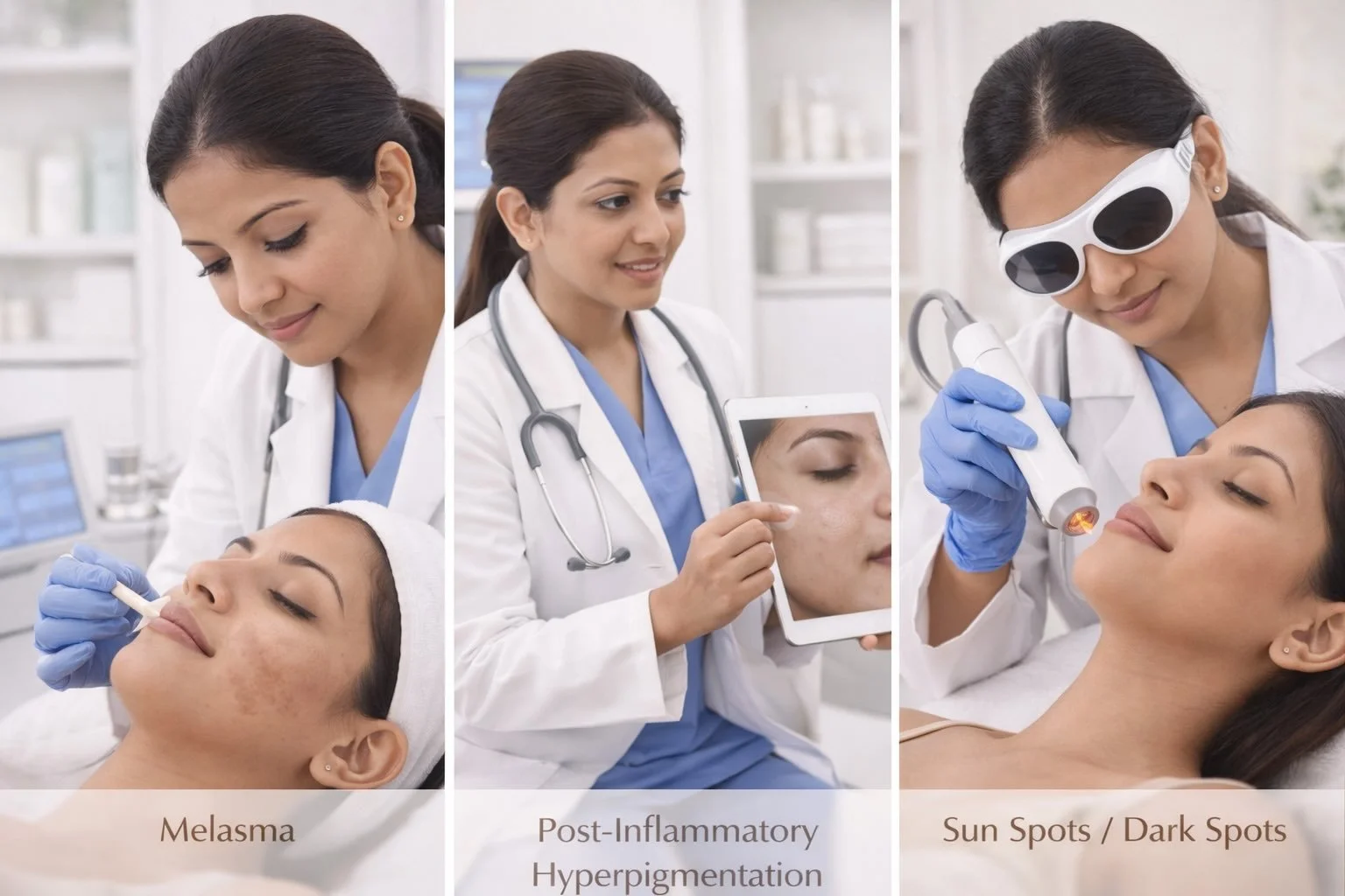 Clean medical-style visual showing melasma, PIH, sun spots