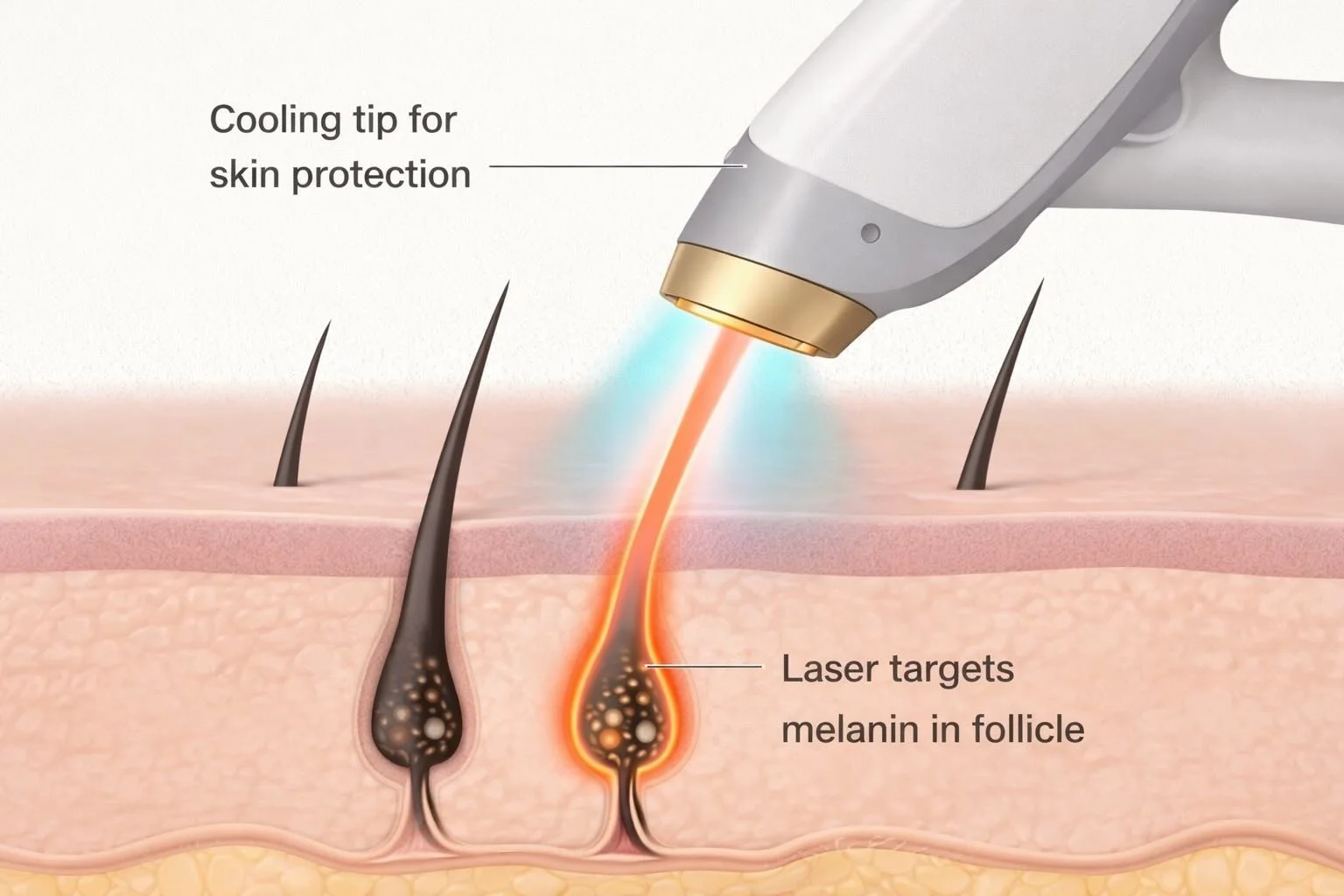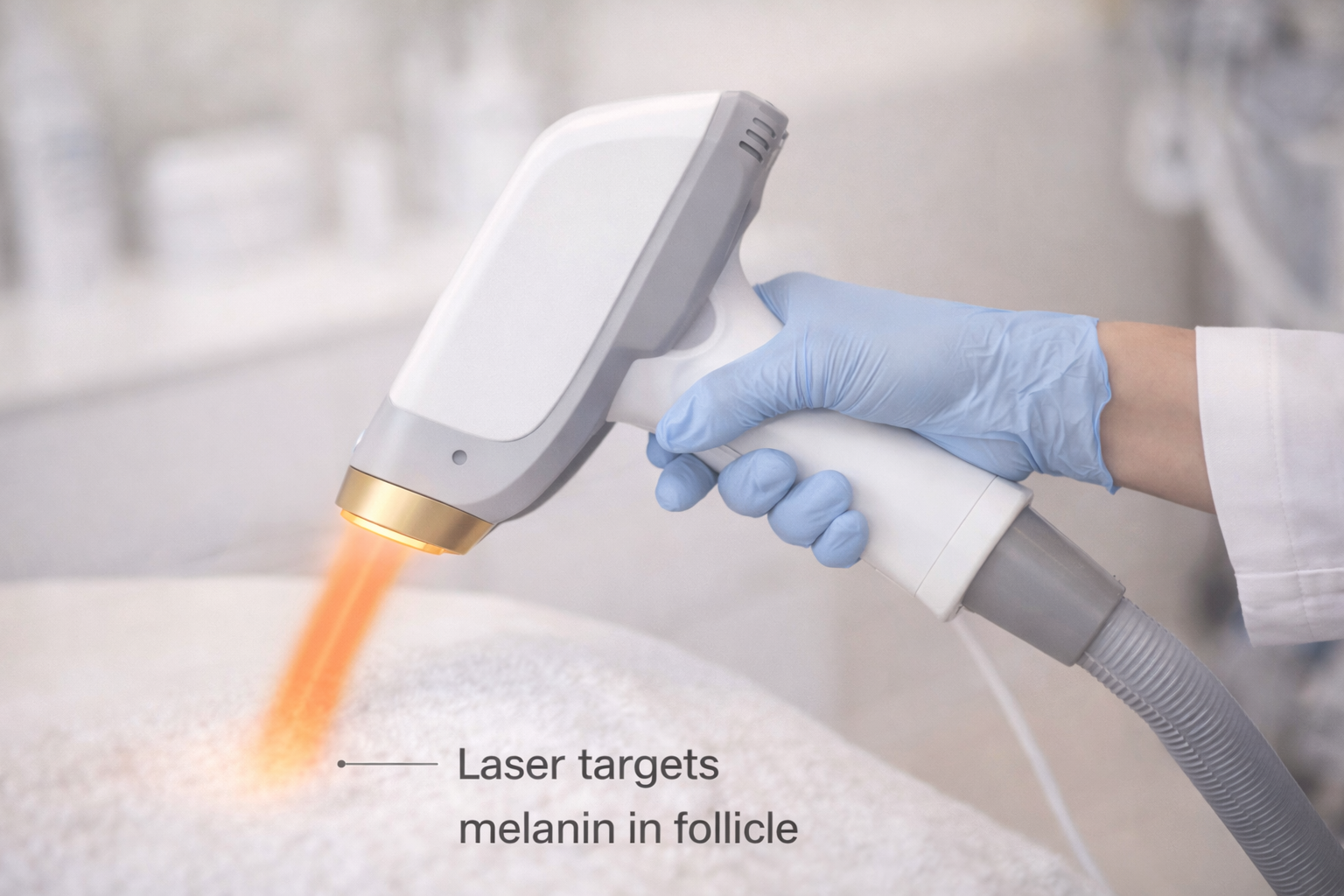 Laser energy targets pigment within the hair follicle and reduces the follicle’s ability to regrow hair over time. Because hair grows in cycles, a series of sessions is required for the best results.